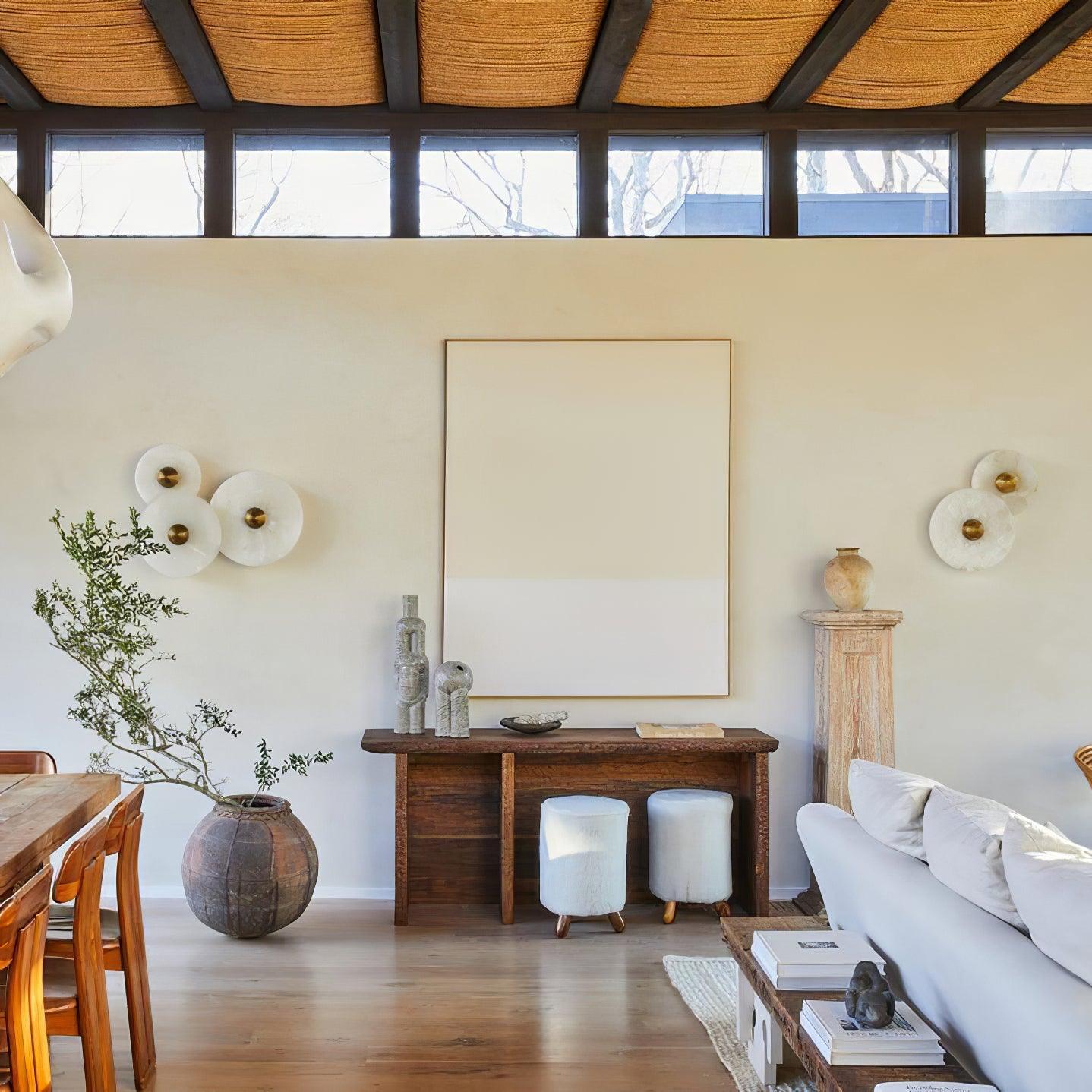 Elegant and sculptural, the Artelux Round Alabaster Combination Wall Lamp features interlocking alabaster discs framed by fluted brass. When lit, the translucent stone emits a soft, warm glow that transforms walls into luminous art. Perfect for living rooms, hallways, bedrooms, or dining spaces, this fixture blends natural material beauty with refined design—making each installation unique.