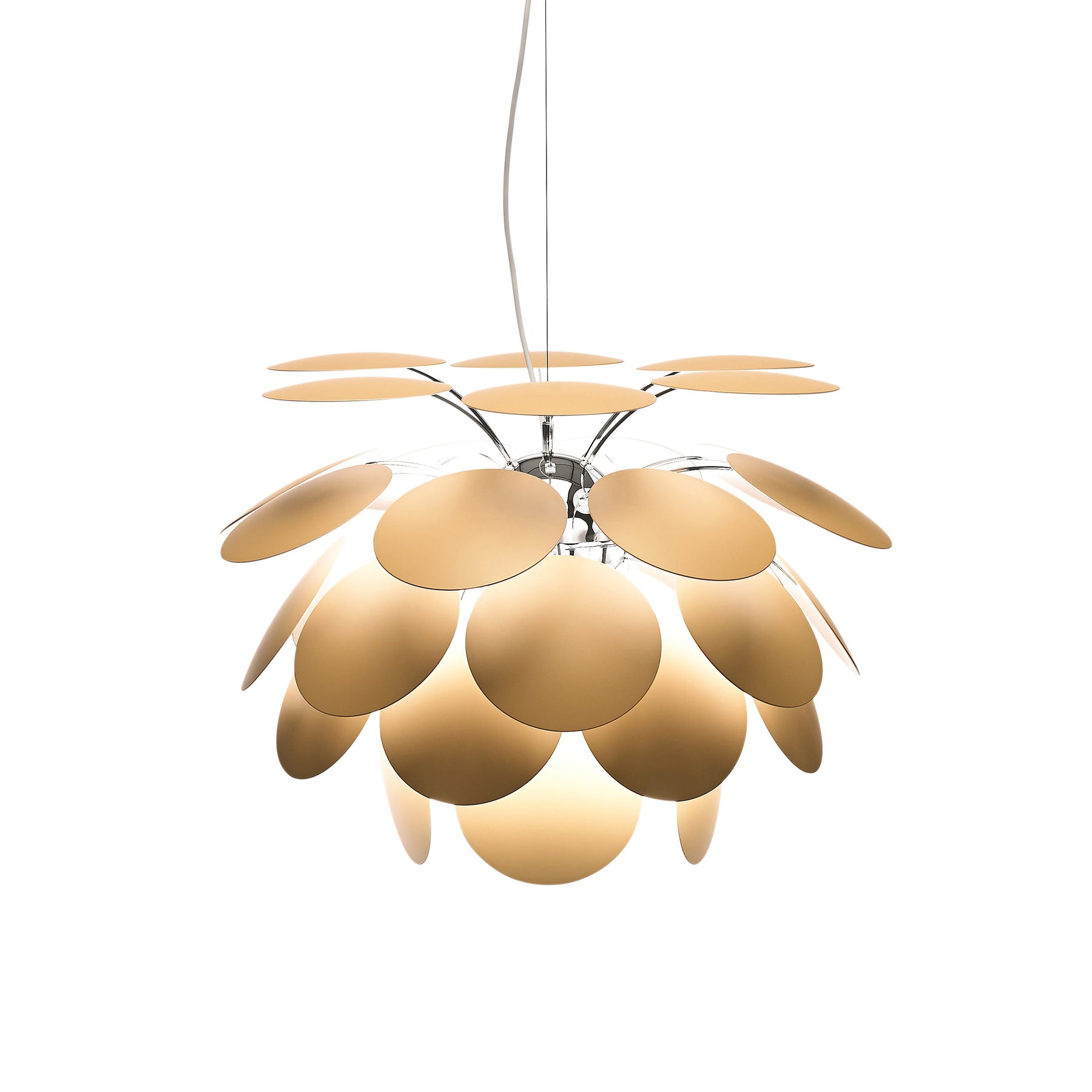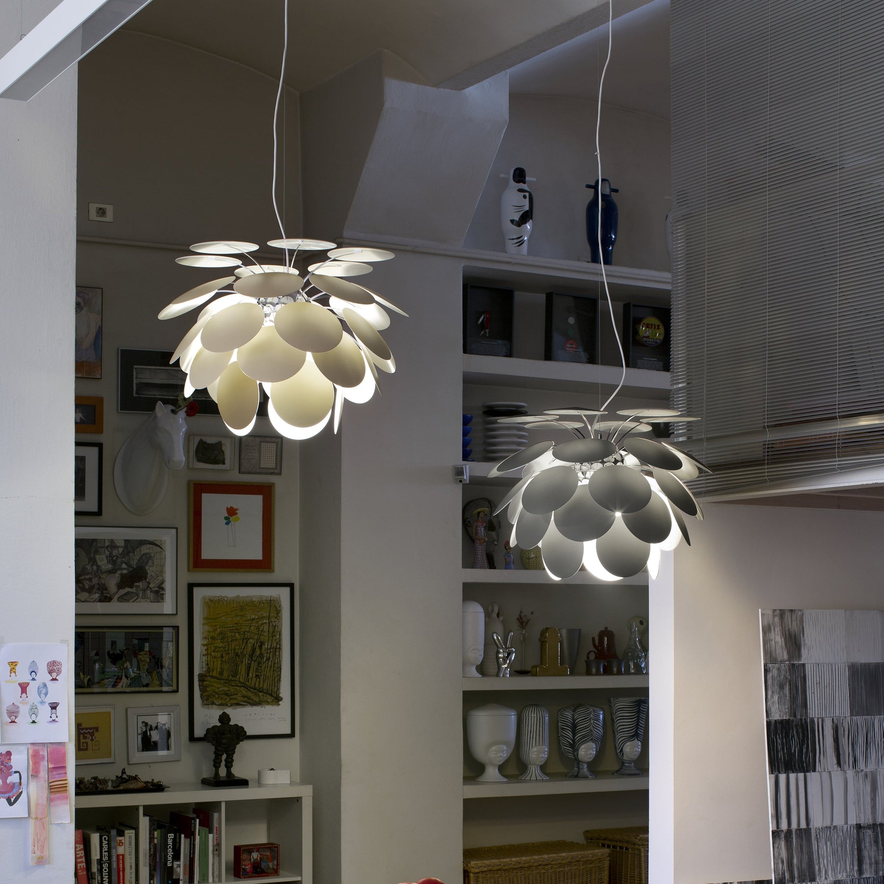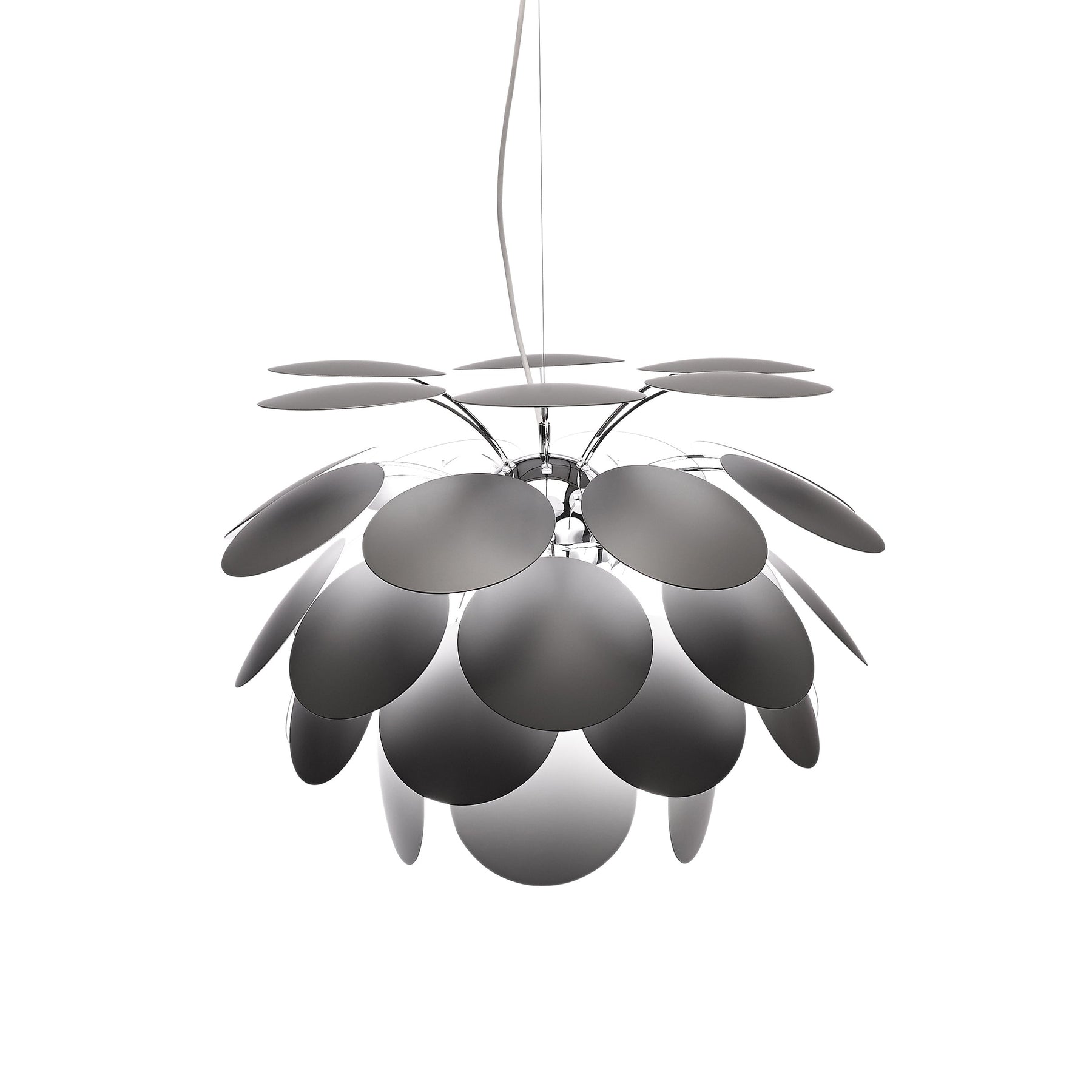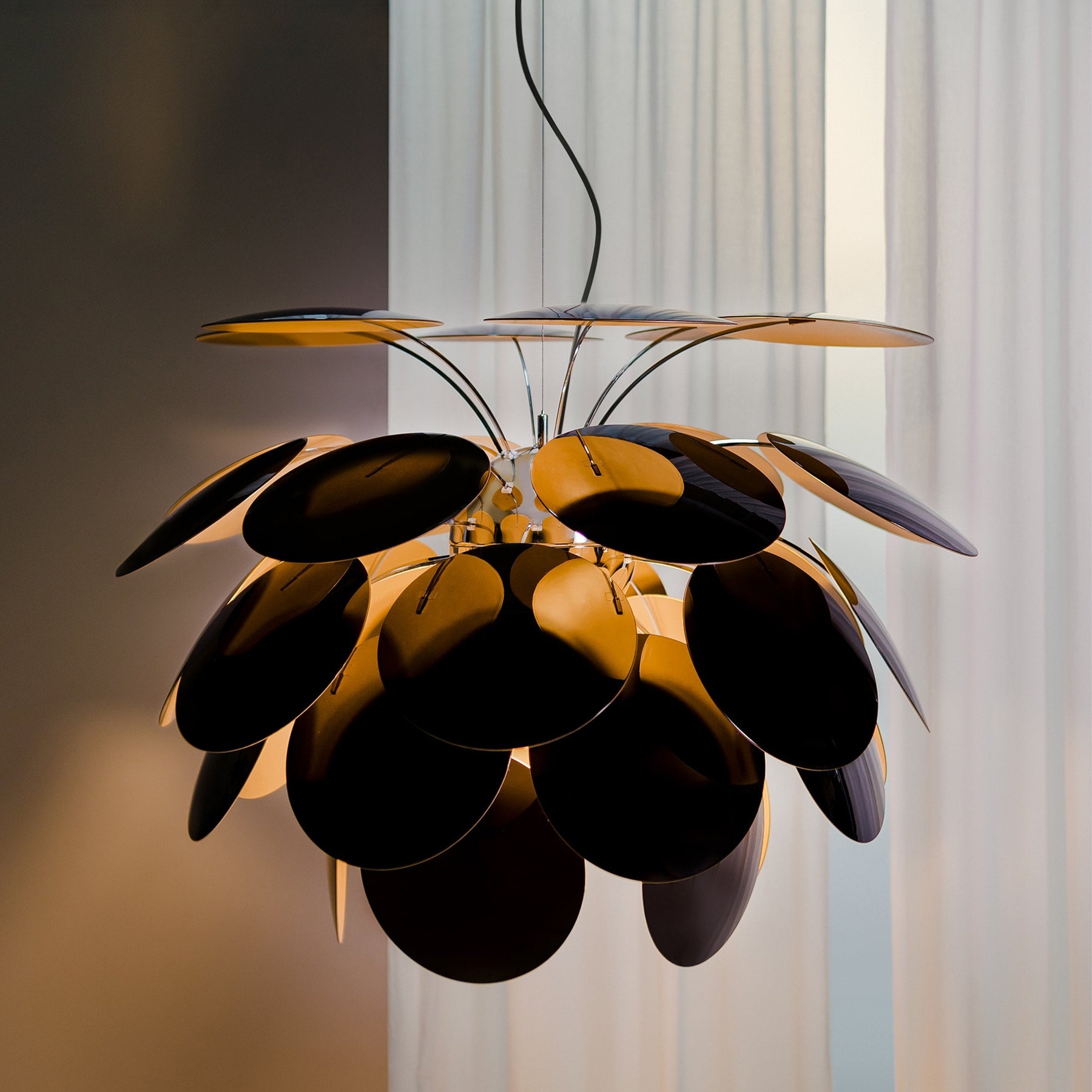 The Artelux Discoco Pendant Light is an iconic design that balances sculptural form with luminous atmosphere. Crafted around a central chromed semi-sphere, lacquered discs are layered in a circular rhythm, refracting and reflecting light to create a captivating interplay of shadow and glow. Its bold yet elegant silhouette transforms dining rooms, lounges, or entryways into artistic spaces, making it both a functional light source and a striking decorative statement.