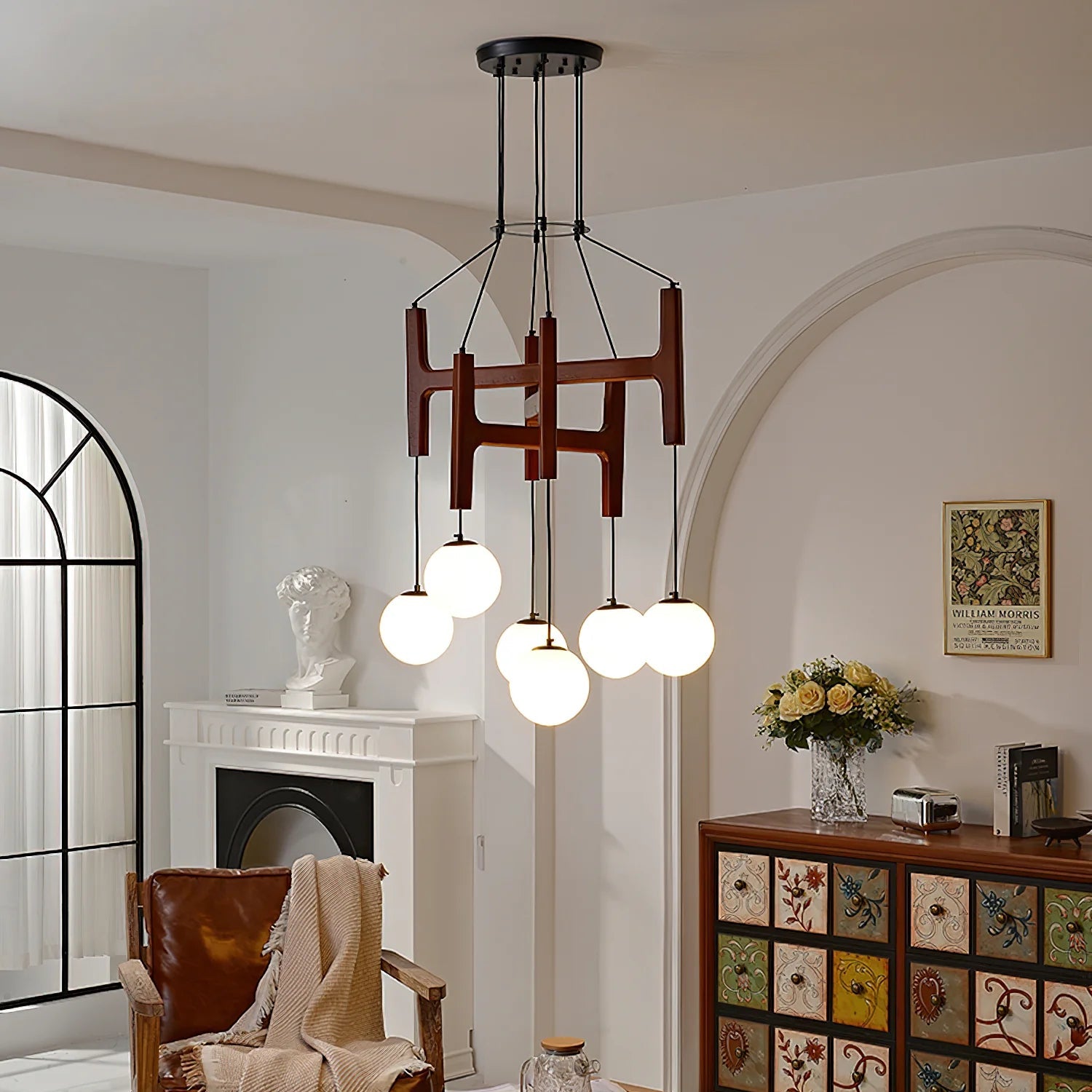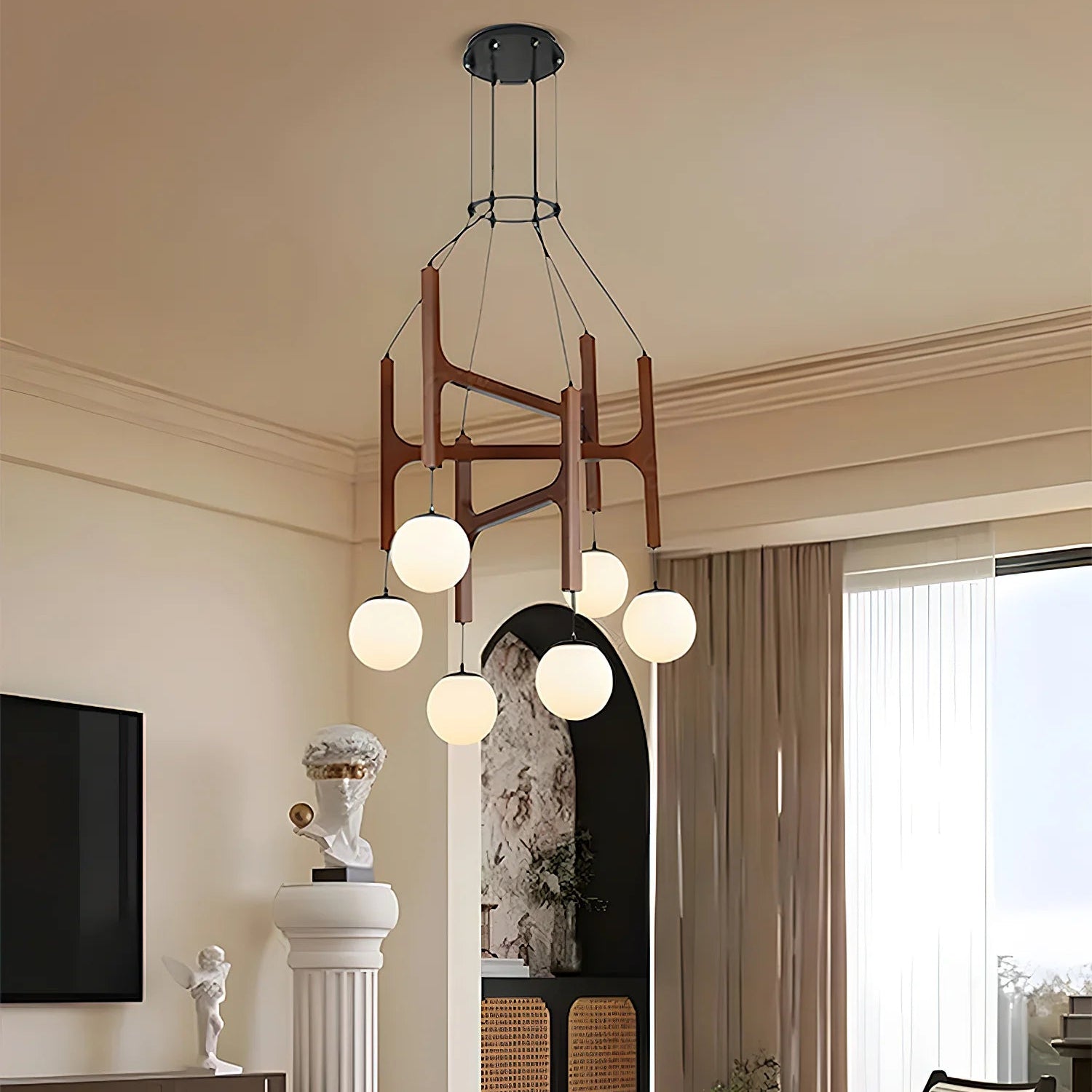 The Hakka Modern Geometric Wooden Chandelier masterfully blends organic warmth with modern geometric design. Crafted from high-quality, sustainably sourced wood, its sculptural form features interlocking celestial patterns that create a stunning visual impact both when illuminated and off. This piece emits a soft, diffused glow, casting intricate shadows and fostering a calm, inviting atmosphere. Ideal for making a bold yet natural statement in dining rooms, living areas, or bedrooms, the Astra is a testament to contemporary artisan craftsmanship.