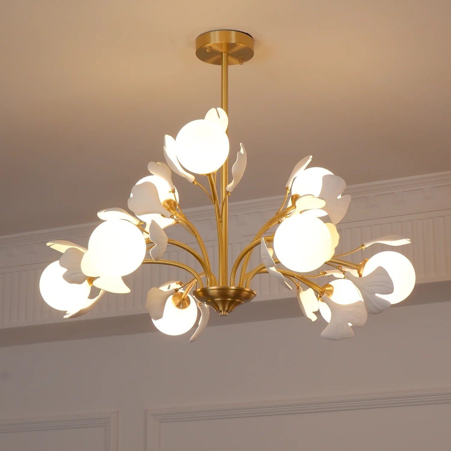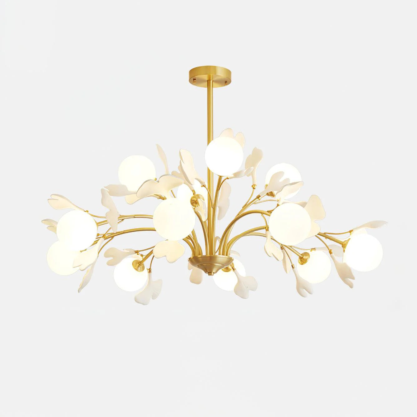 The Vico Gingko Chandelier artfully captures the delicate beauty of gingko leaves in a stunning lighting sculpture. Each intricately detailed metal leaf is carefully arranged to create a sense of organic movement and natural elegance. When illuminated, this chandelier casts beautiful leaf-shaped shadows throughout the space, creating a warm and enchanting atmosphere. Combining nature-inspired design with sophisticated craftsmanship, this piece serves as both a functional light source and a breathtaking work of art that adds timeless beauty to any interior space.