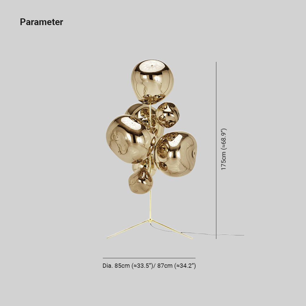 The Artelux Lava Cone Floor Chandelier is an extraordinary statement piece featuring three Melt Mini shades and four Melt shades in a refined gold finish. Crafted in Germany using advanced hot-blown glass techniques, it creates a mesmerizing melted orb effect when lit and a striking mirrored surface when off. Combining sculptural design with dramatic light play, this floor chandelier is perfect for living rooms, dining areas, or modern entryways seeking a bold centerpiece.