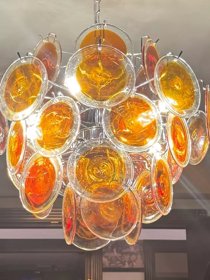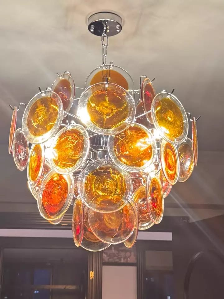 The Artelux Citrus Murano Glass Chandelier showcases handcrafted orange Murano glass discs on a sleek nickel frame. Each disc captures and refracts light with warm translucence, creating a vibrant yet elegant atmosphere. Available in multiple sizes, this chandelier serves as a sculptural centerpiece for dining rooms, living spaces, or entryways, combining Italian glass tradition with modern design.